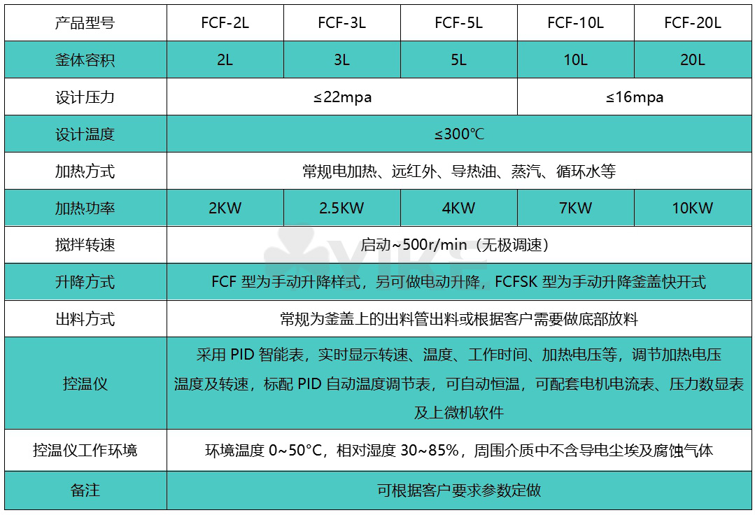 产品型号:FCF-0.1L、FCF-0.5L、FCF-1L、FCF-2L、FCF-3L、FCF-5L、